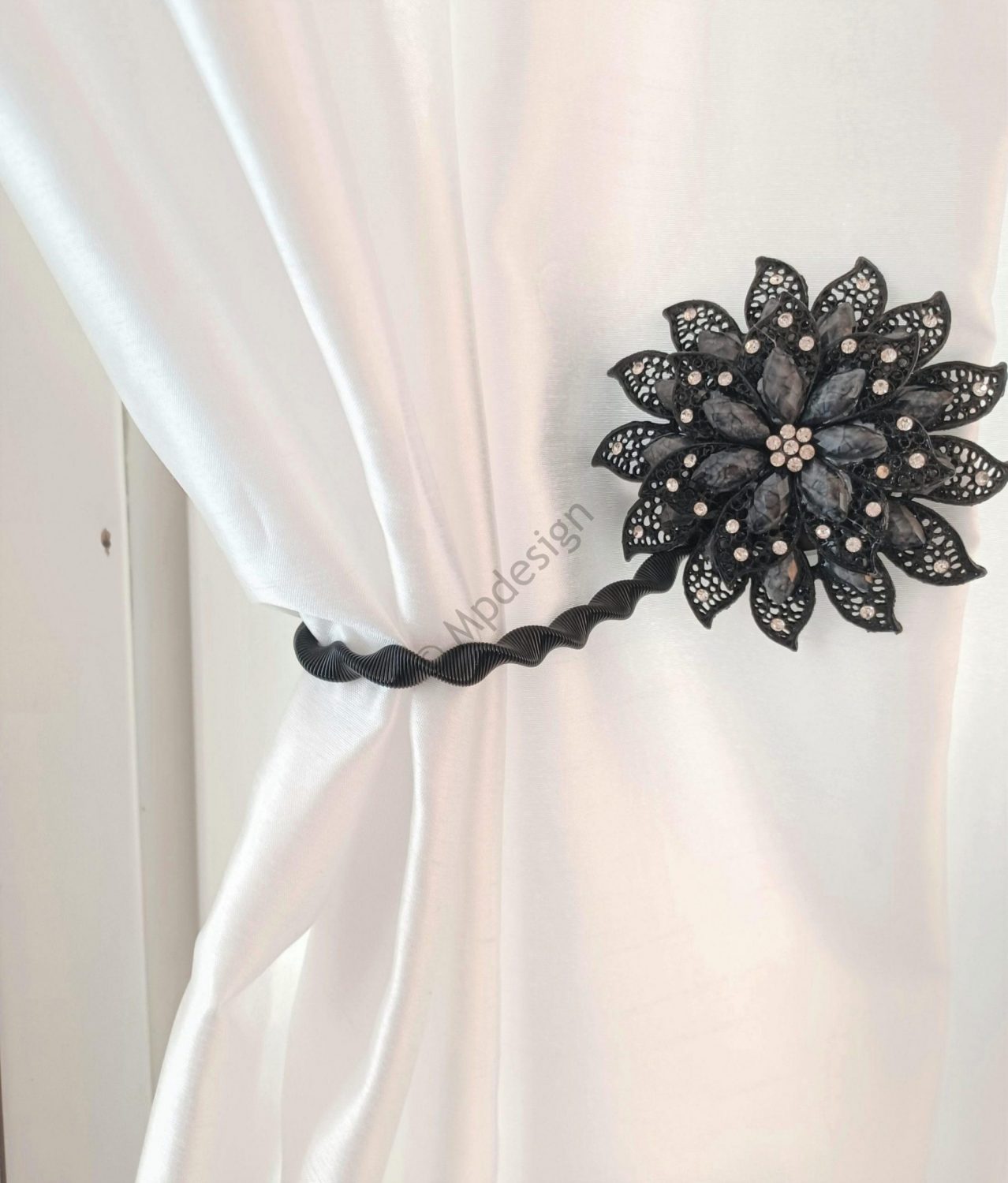 Musta kukka verhopidike magneetilla. Jokaisessa terälehdessä on koristestrasseja.