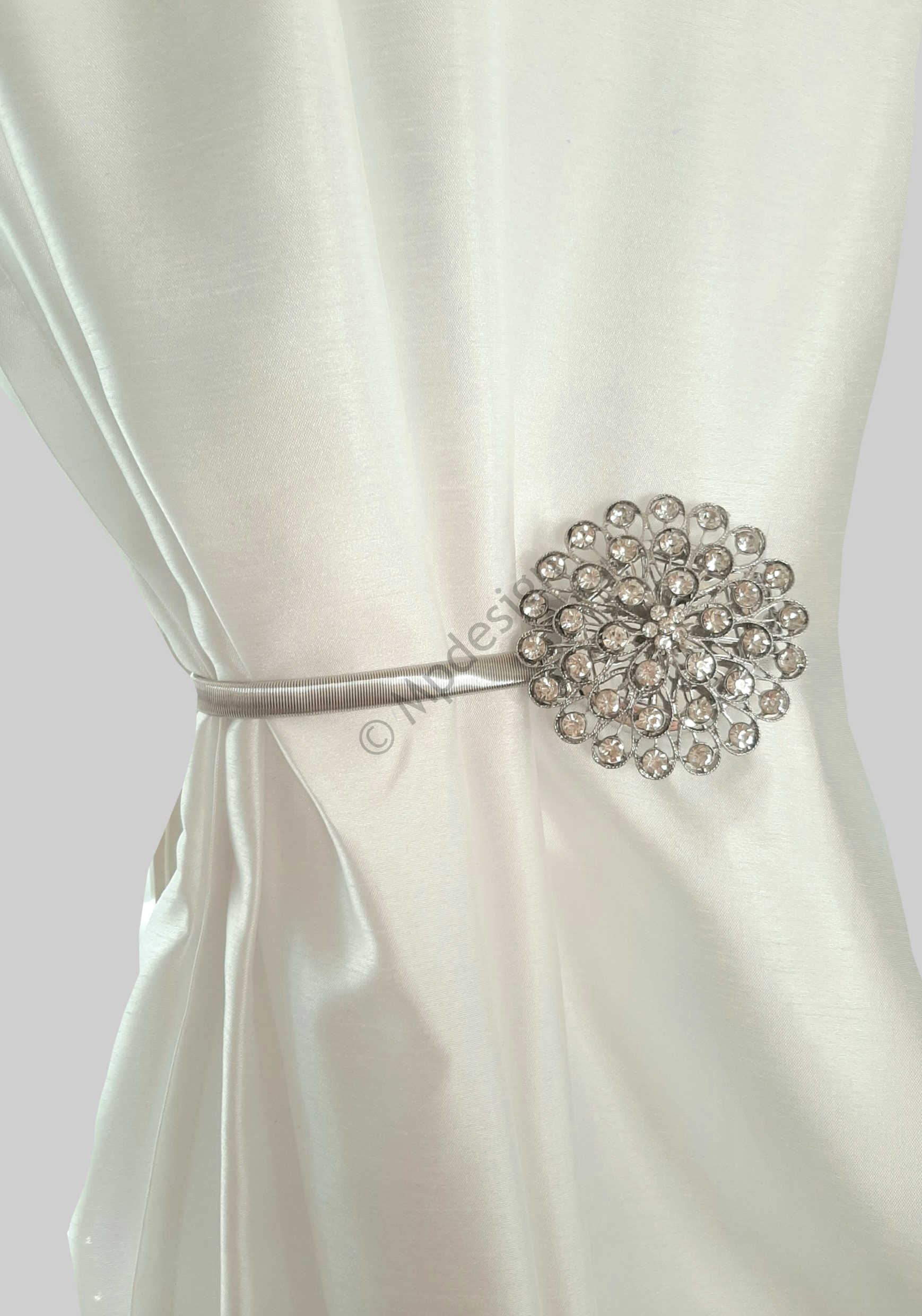 Hopean värinen verhopidike magneetilla. Loistava vaihtoehto seinään porattaville verhokoukuille.Pidikkeen pituus on 23 cm, jonka lisäksi koriste 7 cm.